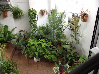 El centro del patio está presidido por una palmera rodeada de plantas de menor porte como son: una hortensia, una hoja de la mortadela, una sombrerina, la espina del señor, un ficus y un helecho entre otras. En las paredes, hay macetas colgadas que contienen cintas, tunitas y helechos. En el zaguán predominan las aspidistras.